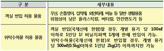 국민 여행편의를 제고하고 동시에 항공보안을 강화하기 위해 지난해 1월 ‘항공기 내 반입금지 위해물품’이 개정되었다. 보안위협 수단에 사용될 가능성이 적은 긴 우산, 손톱깎이, 바늘 등 일반 생활용품이나 위험성이 낮은 버터칼, 플라스틱칼 등의 기내 반입을 허용하는 등 합리적인 수준으로 바뀌어 여행객이 무심코 가져오는 반입금지 물품을 공항에서 포기해야 하는 승객 불만과 불편을 해소할 수 있게 되었다.