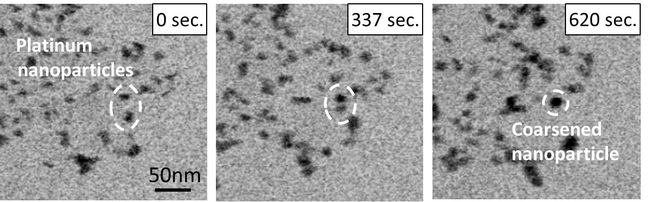 백금의 반응성 저하는 백금 미립자의 조대화(粗大化, Coarsening 결정입자가 굵고 커지는 현상)에 기인하는 것으로 알려져 있지만, 지금까지의 관찰 기법으로는 조대화에 이르는 프로세스를 실시간으로 파악하지 못해 그 요인을 해석하는 것이 어려웠다.