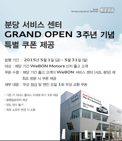 아우디 공식딜러 위본모터스(http://webonmotors.co.kr/)가 분당 서비스센터 그랜드 오픈 3주년을 기념해 프로모션을 진행한다.