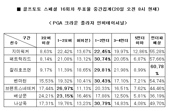 2번으로 지정된 패트릭 리드가 57.66%로 2순위를 차지했고, 1번 지미 워커와 4번벤 마틴이 각각 55.28%와 54.74%로 과반수의 언더파 예상 투표율을 넘겼다.