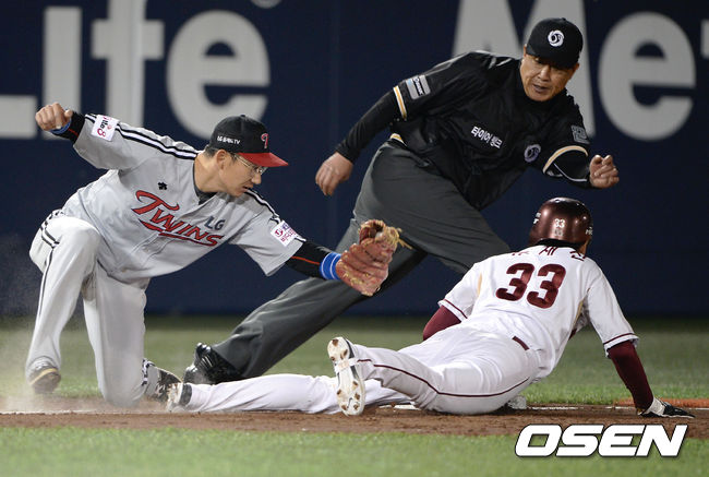 5회말 1사 1,3루 LG 손주인이 유강남의 견제구때 넥센 유재신을 태그아웃으로 잡아내위해 태그를 시도하고 있다.
