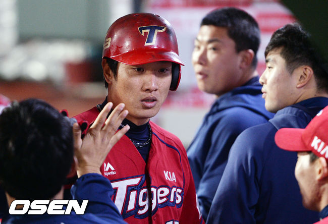 20일 부산 사직구장에서 열린 '2015 타이어뱅크 KBO 리그' 롯데 자이언츠와 KIA 타이거즈의 경기, 4회말 2사 2루 KIA 필의 1타점 2루타때 홈을 밟은 2루 주자 김주찬이 동료들의 축하를 받고 있다. 전타석에서 김주찬은 역전 2타점 적시 2루타를 기록했다.