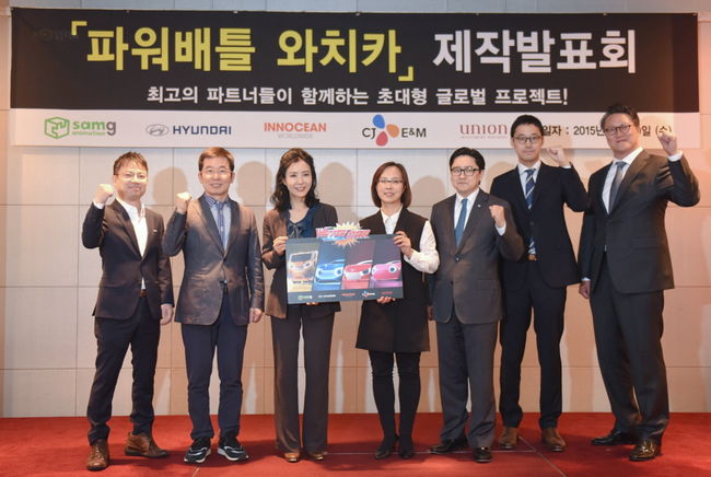 20일 서울 코엑스 인터콘티넨탈 호텔에서 ㈜삼지애니메이션, 현대자동차, ㈜이노션월드와이드, CJ E&M이 글로벌 프로젝트 ‘파워배틀 와치카(가칭)’의 제작발표회를 개최했다. ㈜삼지애니메이션 김수훈 대표, 현대자동차㈜ 마케팅전략실장 최명화 상무, CJ E&M 글로벌사업본부 서현동 상무, ㈜이노션월드와이드 컨텐츠전략본부장 한규형 상무(왼쪽부터) / CJ E&M 제공