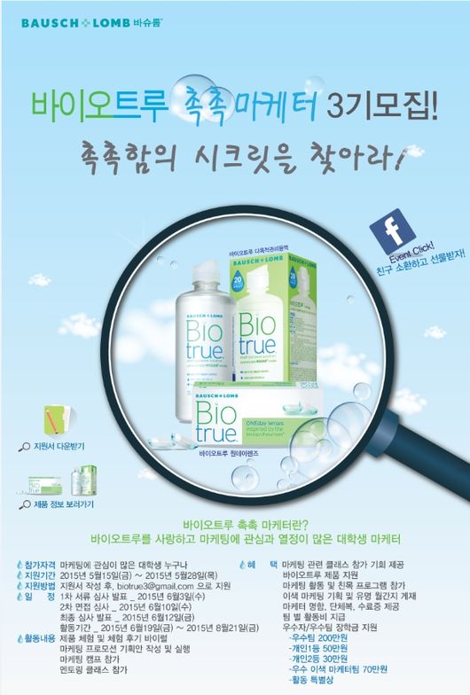 대학생이라면 누구나 바슈롬코리아 공식 홈페이지(www.bausch.co.kr)에서 지원서를 다운받아 오는 28일까지 이메일(biotrue3@gmail.com)로 지원할 수 있다.