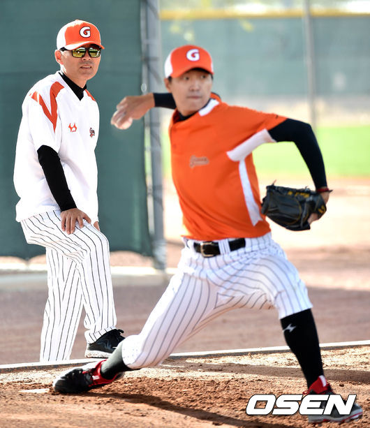 올해 1월 애리조나 캠프에서 구승민의 불펜피칭을 지켜보는 이종운 감독.