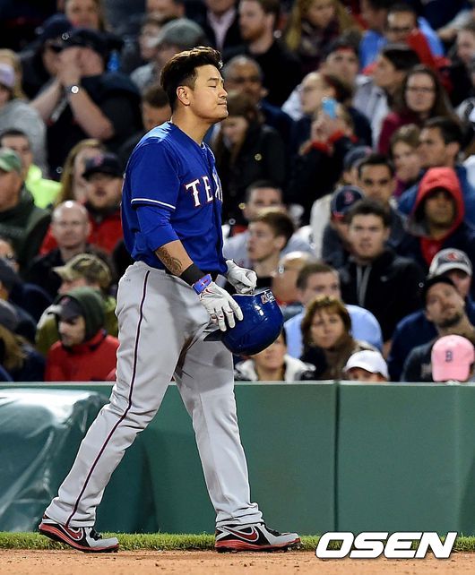 5회초 텍사스 공격 2사 주자없는 상황 추신수가 보스턴 선발 조 켈리에게 향하는 강한 타구를 날렸지만 아쉽게 1루에서 아웃됐다. 아쉬워하는 추신수.
