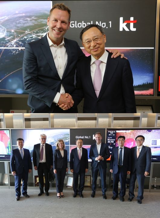 KT 광화문 East 사옥에서 KT 황창규 회장과 텔리아소네라 요한 다넬린드 최고경영자가 5G 사업협력에 대해 논의하고 기념사진을 촬영하고 있는 모습. 아래는 KT 광화문 East 사옥에서 KT 황창규 회장과 텔리아소네라 요한 다넬린드 최고경영자을 비롯, 양사 임원진이 5G 사업협력에 대해 논의하고 기념사진을 촬영하고 있는 모습. / KT 제공