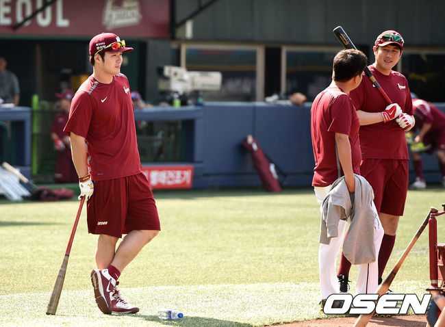 21일 오후 서울 목동구장에서 열릴 '2015 타이어뱅크 KBO리그' 넥센 히어로즈와 LG 트윈스의 경기에 앞서 넥센 유한준과 박병호가 타격 훈련을 준비하고 있다.