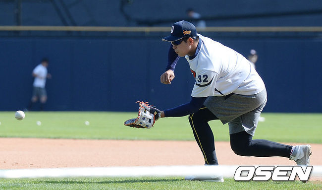 21일 오후 서울 잠실야구장에서 열린 '2015 타이어뱅크 KBO 프로야구' 두산 베어스와 삼성 라이온즈의 경기, 경기시작전 두산 김재환이 훈련하고 있다.