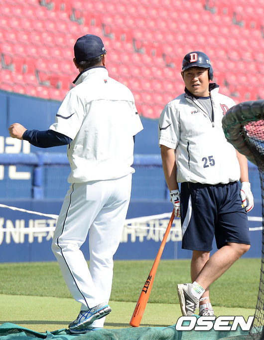 21일 오후 서울 잠실야구장에서 열린 '2015 타이어뱅크 KBO 프로야구' 두산 베어스와 삼성 라이온즈의 경기, 경기시작전 두산 양의지가 훈련하고 있다.
