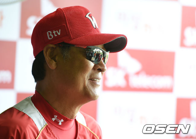 SK 김용희 감독이 경기에 앞서 취재진과 이야기를 나누고 있다.