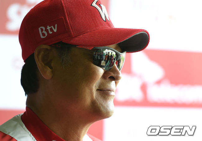 SK 김용희 감독이 경기에 앞서 취재진과 이야기를 나누고 있다.
