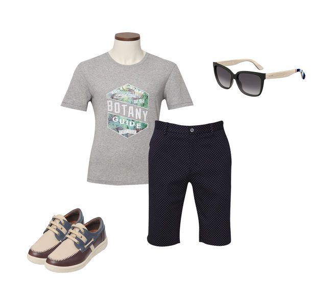 여행 느낌이 물씬 풍기는 팜비치 그래픽 티셔츠에 활동성 좋은 숏 팬츠와 밝은 계열의 데크 슈즈를 매치하면 패셔너블하면서도 시원한 리조트 룩을 완성할 수 있다. 일반 팬츠와 매치할 때는 롤업 스타일로 발목이 살짝 보이는 것이 세련돼 보인다.