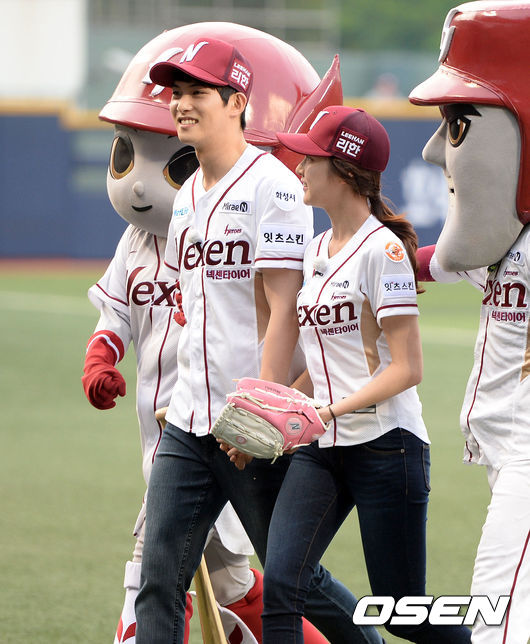 부부의 날을 맞아 '우결' 커플 이종현과 공승연이 시구를 마치고 그라운드를 나가고 있다.