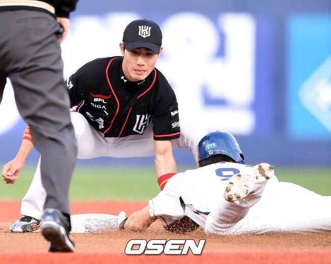 21일 오후 경남 마산구장서 열린 '2015 타이어뱅크 KBO 리그' NC 다이노스와 kt 위즈의 경기, 1회말 1사 1루 NC 나성범의 타석때 kt 심우준 유격수가 1루 주자 김종호의 도루를 태그아웃 시키고 있다.