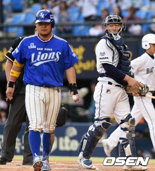 21일 오후 서울 잠실야구장에서 열린 '2015 타이어뱅크 KBO 프로야구' 두산 베어스와 삼성 라이온즈의 경기, 2회초 1사 주자 1,3루 삼성 박석민이 박해민의 2루수 앞땅볼에 홈으로 들어오다 아웃당하고 있다.
