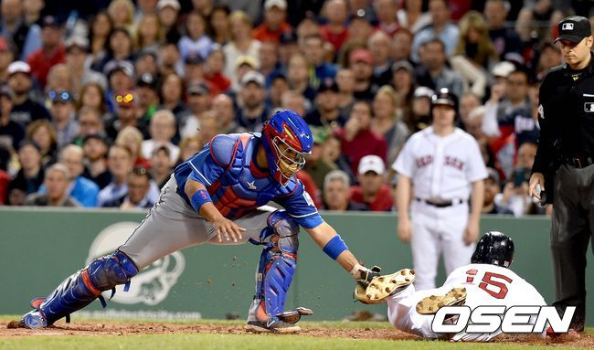 4회말 보스턴 공격 1사 3루 상황 헨리 라미레스의 스퀴즈 번트 때 3루 주자 더스틴 페드로이아가 홈으로 쇄도했지만 텍사스 포수 카를로스 코포란의 태그에 걸려 아웃되고 있다.