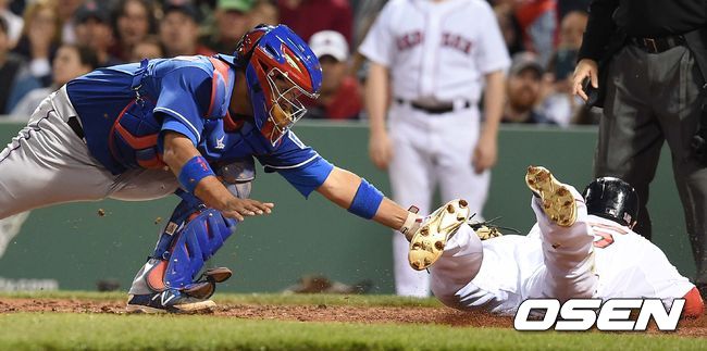 4회말 보스턴 공격 1사 3루 상황 헨리 라미레스의 스퀴즈 번트 때 3루 주자 더스틴 페드로이아가 홈으로 쇄도했지만 텍사스 포수 카를로스 코포란의 태그에 걸려 아웃되고 있다.