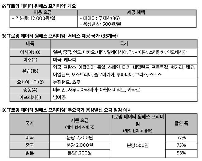 'T로밍 데이터 원패스 프리미엄'은 데이터 로밍을 무제한으로 이용할 수 있는 ‘T로밍 데이터무제한 원패스’(일 9000원)에 3000원만 추가하면 해외에서 한국이나 현지로 음성 발신 시 분당 500원의 낮은 요금으로 이용 가능한 상품이다.
