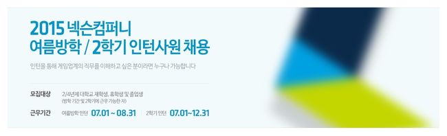 넥슨과 넥슨지티가 이달 22일부터 다음달 8일까지 2015년도 여름방학(단기) 및 2학기(장기) 인턴사원을 공개 채용한다.