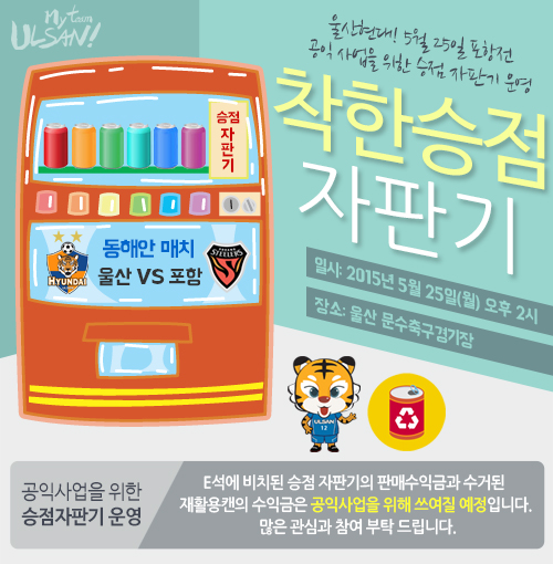 울산현대는 오랜 라이벌 포항과의 ‘동해안 더비’에 승리를 향한 팬들의 염원을 담아 ‘착한승점자판기’와 ‘고철수거함’을 운영한다. 울산현대는 재치 있는 도발과 따뜻한 나눔을 통해 팬들의 관심을 끌어, 이번 ‘동해안 더비’ 라이벌전을 더욱 흥미롭게 진행한다. 또한 팬들도 이번 이벤트를 통해 따뜻한 나눔에 자연스럽게 참여하게 된다.
