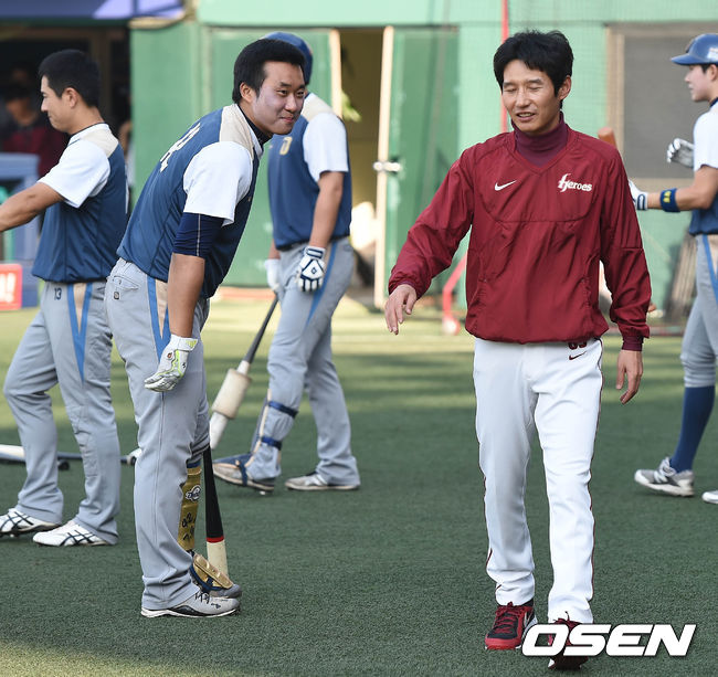22일 오후 서울 목동구장에서 열리는 '2015 타이어뱅크 KBO 리그' 넥센 히어로즈와 NC 다이노스의 경기 시작전 김태군이 염경엽 감독과 이야기를 나눈 후 인사를 하고 있다.