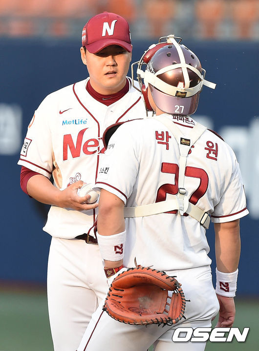 22일 오후 서울 목동구장에서 열린 '2015 타이어뱅크 KBO 리그' 넥센 히어로즈와 NC 다이노스의 경기 1회초 무사 2,3루 나성범에게 2타점 2루타를 허용한 김동준이 박동원과 이야기를 나누고 있다.