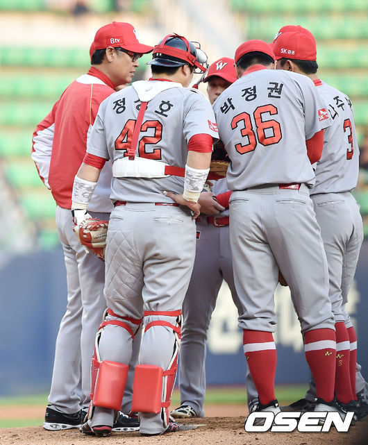 22일 오후 서울 잠실야구장에서 열린 '2015 타이어뱅크 KBO 리그' 두산 베어스와 SK 와이번스의 경기, 1회말 1사 주자 만루 두산 양의지 타석에서 SK 김용희 감독이 마운드 근처에 올라 선수들을 모아 얘기를 나누고 있다.