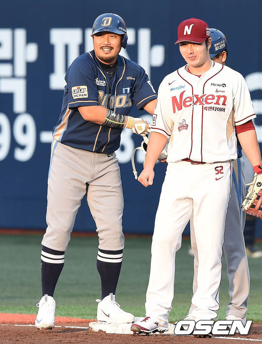 22일 오후 서울 목동구장에서 열린 '2015 타이어뱅크 KBO 리그' 넥센 히어로즈와 NC 다이노스의 경기 1회초 1사 3루 이호준이 1타점 적시타를 치고 1루에서 미소를 짓고 있다.