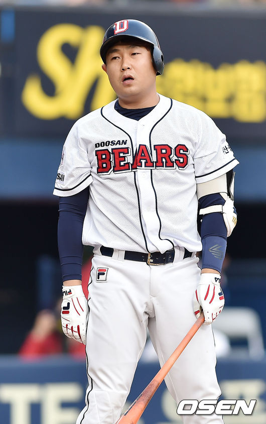 22일 오후 서울 잠실야구장에서 열린 '2015 타이어뱅크 KBO 리그' 두산 베어스와 SK 와이번스의 경기, 1회말 1사 주자 만루 두산 양의지가 타석에서 삼진아웃을 당한 후 아쉬워하고 있다.