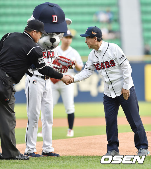22일 오후 서울 잠실야구장에서 열린 '2015 타이어뱅크 KBO 리그' 두산 베어스와 SK 와이번스의 경기, 박원순 서울 시장이 시구 전 문승훈 구심과 악수를 나누고 있다.