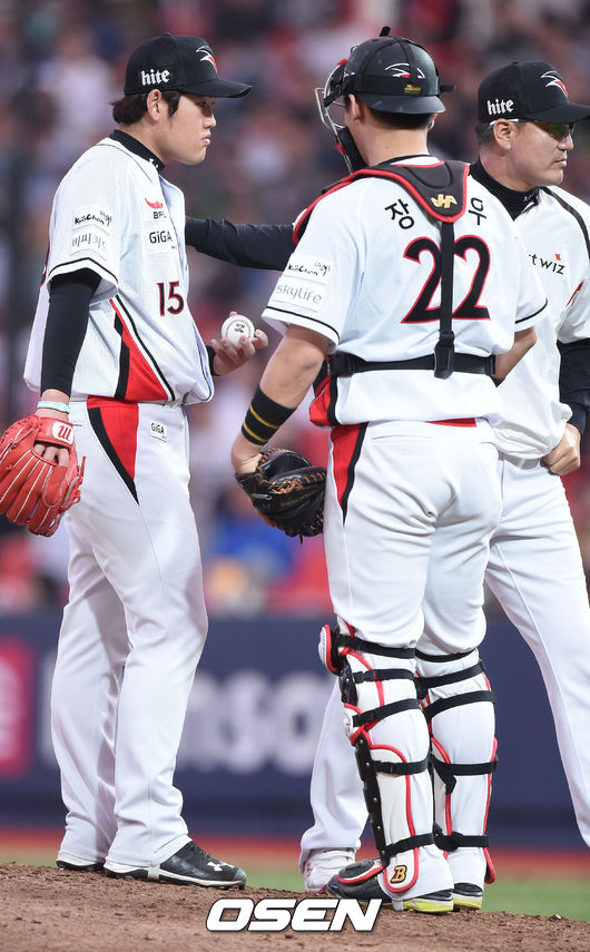 22일 오후 경기도 수원시 수원구장서 열린 ‘2015 타이어뱅크 KBO리그’ kt 위즈와 한화 이글스의 경기, 3회초 kt 선발투수 정대현이 강판되고 있다.