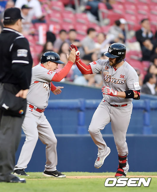22일 오후 서울 잠실야구장에서 열린 '2015 타이어뱅크 KBO 리그' 두산 베어스와 SK 와이번스의 경기, 3회초 1사 주자 1루 SK 브라운이 중월 역전 투런 홈런을 날린 후 그라운드를 돌고 있다.