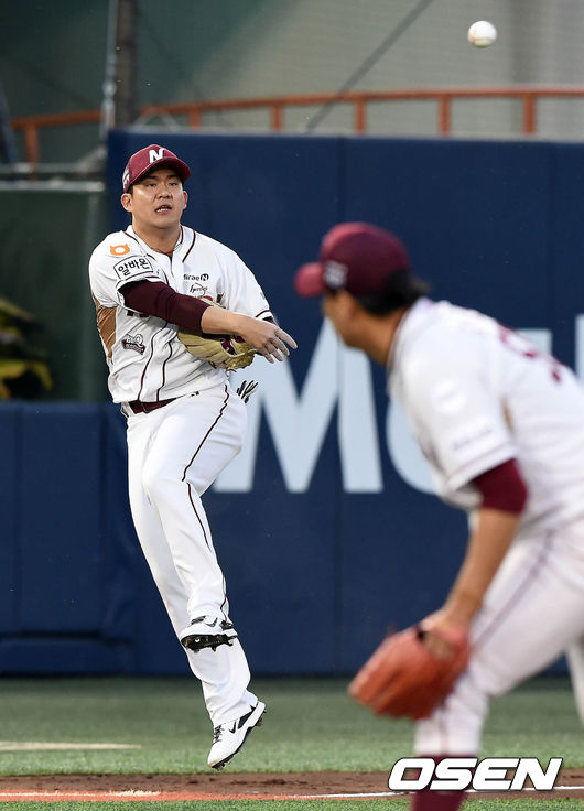 22일 오후 서울 목동구장에서 열린 '2015 타이어뱅크 KBO 리그' 넥센 히어로즈와 NC 다이노스의 경기 4회초 1사 손시헌의 땅볼을 김민성이 잡아 1루로 송구하고 있다.