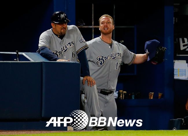 밀워키 구원 투수 윌 스미스(우측)가 애틀랜타 브레이브스전 도중 팔에 이물질을 바른 것이 적발 돼 퇴장이 선언 된 직후 덕아웃에서 불만을 표하고 있다./ ⓒAFPBBNews = News1(무단전재 및 재배포 금지)