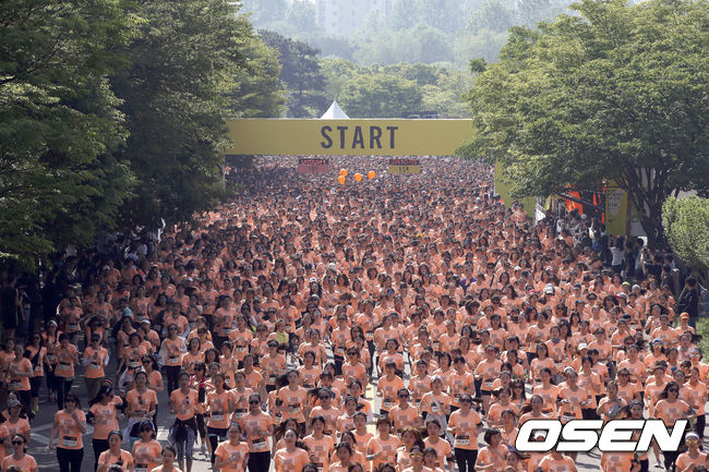 참가자들이 스타트 라인을 힘차게 출발하고 있다.