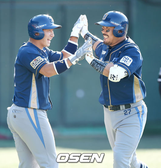 23일 오후 서울 목동구장서 열린 ‘2015 타이어뱅크 KBO리그’넥센 히어로즈와 NC 다이노스의 경기,1회초 NC 이호준이 2점 홈런을 날린뒤 동료들의 축하를 받고 있다.