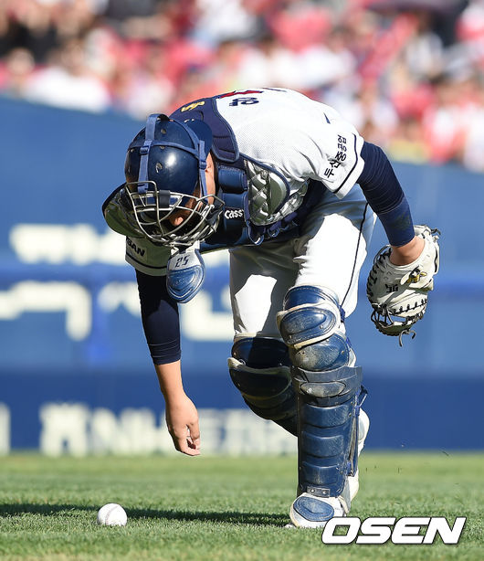 23일 오후 서울 잠실구장에서 열린 '2015 타이어뱅크 KBO리그' 두산 베어스와 SK 와이번스의 경기, 1회초 무사 1루에서 두산 양의지가 SK 조동화의 번트 타구를 처리하지 못하며 아쉬워하고 있다.