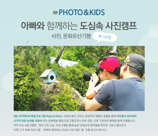 디지털 광학 이미징 기술 선도기업 캐논코리아컨슈머이미징㈜(대표이사 강동환, www.canon-ci.co.kr)이 포토앤키즈(Photo&Kids) 두 번째 프로그램 '아빠와 함께하는 도심 속 사진 캠프'를 오는 6월 6일 진행한다.