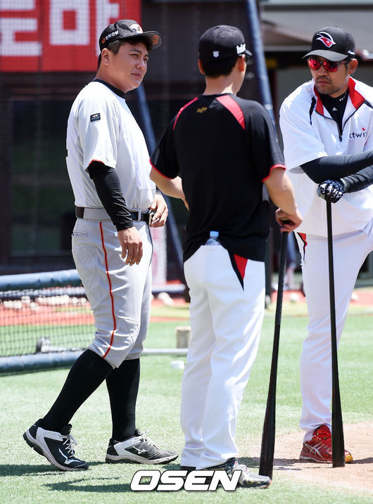 [OSEN=수원, 박준형] 24일 오후 경기도 수원시 수원구장서 열리는 '2015 타이어뱅크 KBO리그' kt 위즈와 한화 이글스의 경기전 한화 김태균이 kt 김민재 코치와 인사를 나누고 있다.