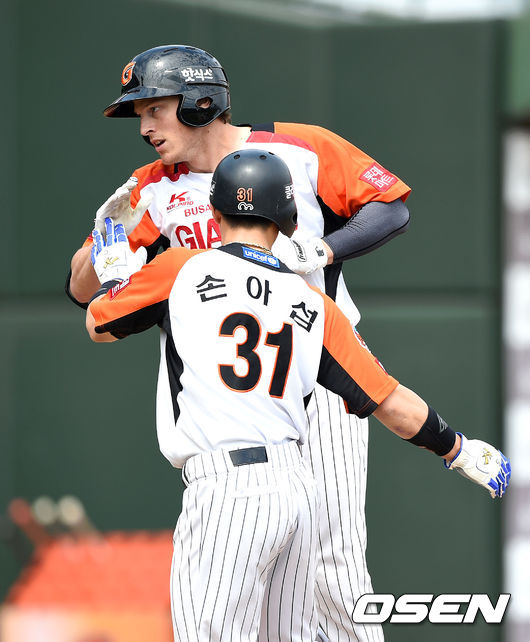 1회말 1사 2루에서 롯데 아두치가 우월 투런 홈런을 치고 홈에서 손아섭과 하이파이브를 하고 있다.