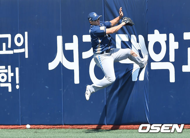 2회말 1사 NC 나성범이 넥센 김민성의 파울 타구를 잡기위해 몸을 날리고 있다.