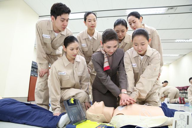 이번 교육의 일환으로 아시아나항공 캐빈서비스훈련팀은 지난 22일 강서구 오쇠동 아시아나타운 교육훈련동에서 신입 캐빈승무원 26명을 대상으로 항공기 사고 대응 안전훈련을 실시했다. 이 과정을 통해 심폐소생술, 자동심실제세동기(AED) 사용법 등 기내환자 발생 상황의 응급처치에 대해 실습했다.