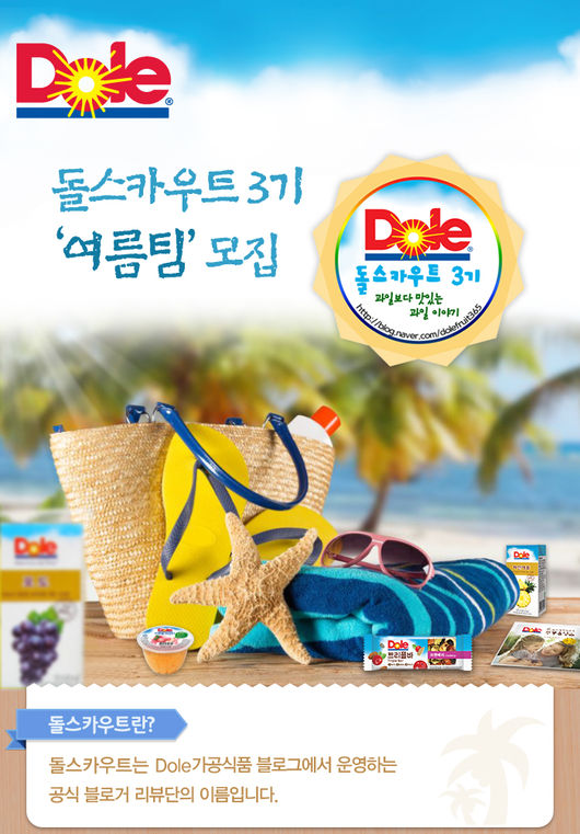 이번 ‘돌 스카우트’ 3기의 여름 팀은 결혼 전 미혼 여성 및 자녀가 없는 신혼 여성 중 블로그를 운영하고 있는 누구나 지원가능하며, 6월부터 8월까지 약 3개월간 Dole(돌) 가공식품의 주력제품과 신제품들을 먼저 체험해 보고, 제시된 주제에 맞는 활동 후기를 작성한다. 이들은 Dole가공식품 블로그를 다양한 이웃들에게 알리는 역할을 하게 된다.