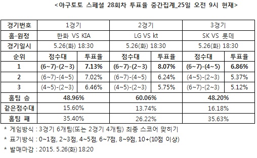 [야구토토] 국민체육진흥공단(www.kspo.or.kr)이 발행하는 체육진흥투표권 공식 온라인 발매 사이트 베트맨(www.betman.co.kr)이 오는 26일에 열리는 2015시즌 한국프로야구(KBO) 3경기를 대상으로 한 야구토토 스페셜 28회차 투표율을 중간 집계한 결과, 참가자의 48.96%는 한화-KIA(1경기)전에서 한화의 승리를 예상했다.