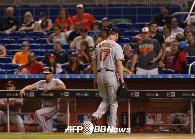 24일 마이애미 말린스전 도중 팔에 이불질을 바르고 투구했다 퇴장이 선언 된 볼티모오 오리올스 좌완 투수 브라이언 매터스가 물러나고 있다. /ⓒAFPBBNews = News1(무단전재 및 재배포 금지)