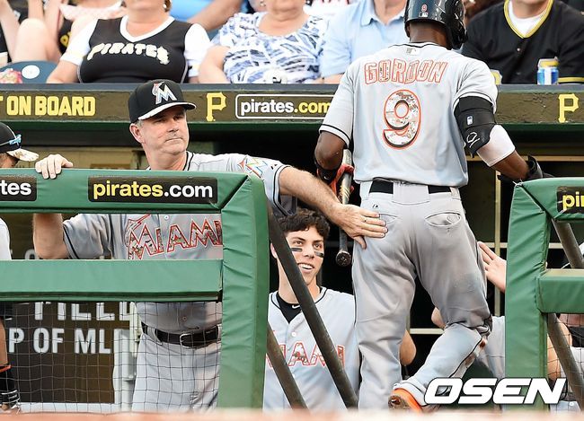 1회초 마이애미 공격 1사 3루 상황 지안카를로 스탠튼의 선제 1타점 좌전안타 때 득점에 성공한 디 고든이 댄 제닝스 감독의 인사를 받고 있다.
