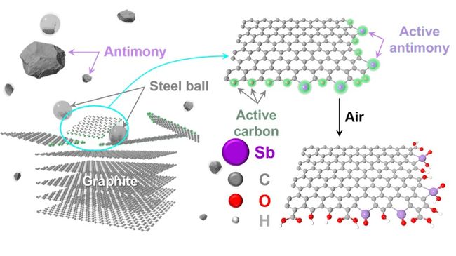 기계화학적 공정에 의한 안티몬이 도입된 그래핀 제조 모식도. 금속볼의 운동에너지에 의해 분쇄된 흑연의 탄소-탄소 결합이 끊어지면서 활성 탄소가 생성되고 이렇게 생성된 활성탄소의 높은 반응성이 탄소-안티몬 결합을 형성해 준금속인 안티몬이 그래핀의 가장자리에 선택적으로 도입된다. /미래창조과학부 제공.