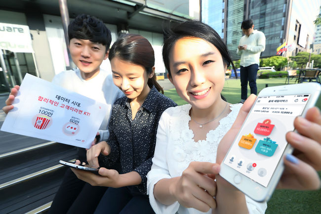 KT(회장 황창규,www.kt.com)가 지난 8일 국내 최초 ‘데이터 선택 요금제’ 출시로 데이터 시대를 선도하고 있는 가운데, 합리적인 데이터 이용을 돕는 ‘팝콘(혜택쿠폰)’, ‘패밀리박스’, ‘데이터 밀당’ 등의 다양한 데이터 혜택 서비스가 이용자들의 큰 호응을 얻고 있다고 밝혔다.