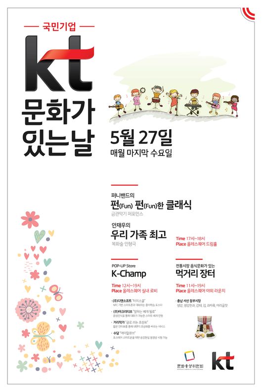 KT(회장 황창규, www.kt.com)가 오는 27일 KT 광화문빌딩 West 올레스퀘어에서 가정의 달을 맞아 어린이를 위한 다양한 문화 행사를 개최한다고 밝혔다. 이는 문화체육관광부와 문화융성위원회가 시행하는 ‘문화가 있는 날’ 캠페인의 일환으로 광화문을 찾는 시민들을 위해 KT가 매월 마지막 수요일 진행하고 있는 행사이다.